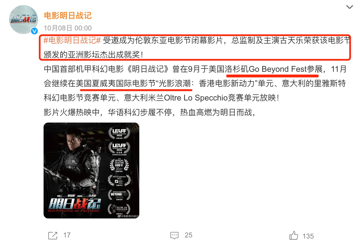 不只如斯,据官博泄漏,中国首部机甲科幻电影《明日战记》将于9月于美国洛杉矶Go Beyond Fest参展,11月会持续在美国夏威夷国际电影节“光影海潮:香港电影新动力”单位、意大利的里雅斯特科幻电影节比赛单位、意大利米兰Oltre Lo Specchio比赛单位放映!