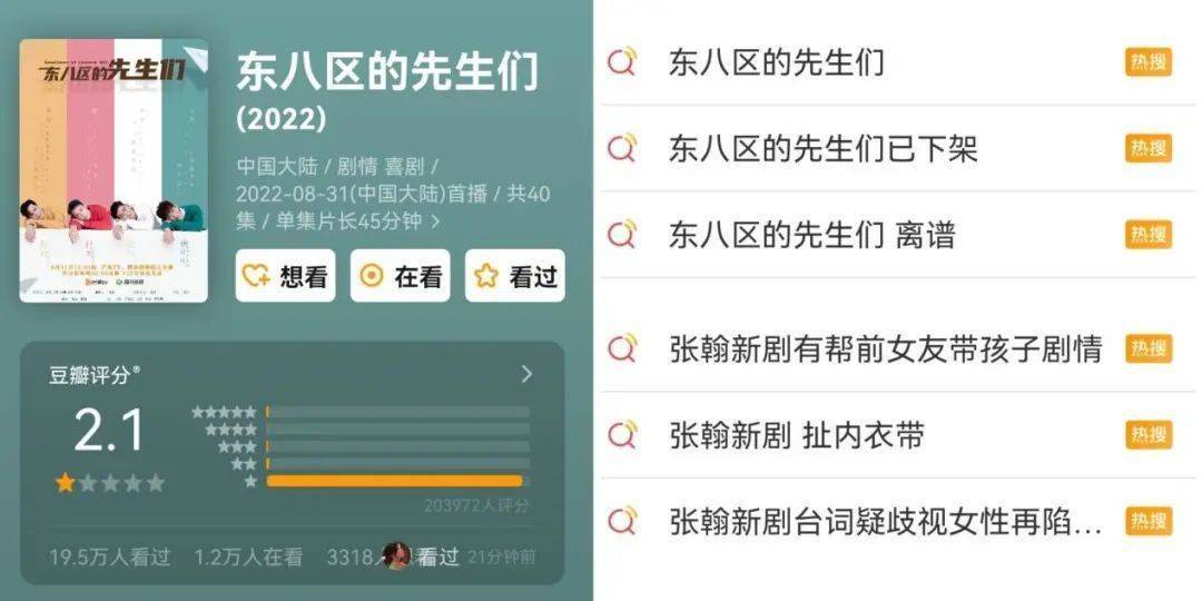 然则这部剧的高存眷度,却其实不是出自人们的夸奖和安利,而是漫山遍野的争议与质疑。#东八区的先生们 油腻##张翰新剧 扯亵服带##张翰新剧台词疑轻视女性再陷争议#等话题接连登上微博热搜,豆瓣评分更是降至2.1,完满“击败”人们吐槽多年的《逐梦演艺圈》,现在更是直接落得个下架的惨痛终局。