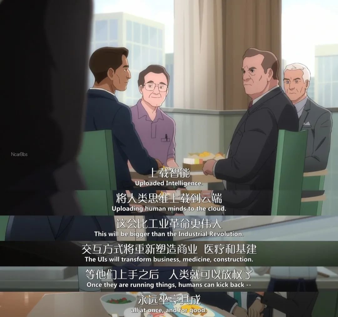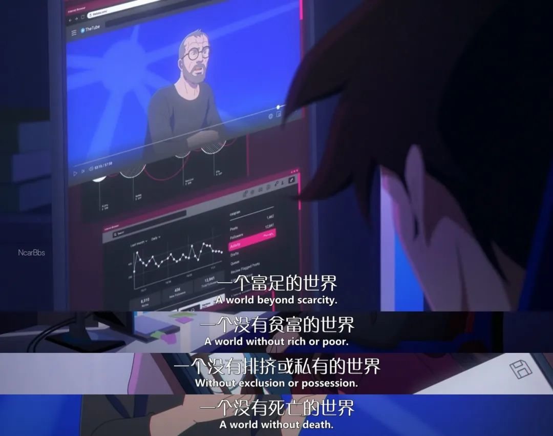 剧中「标记节奏」的创始人斯蒂芬研讨UI的缘由,依照他的话说,是为了树立一个“没有灭亡的世界”。