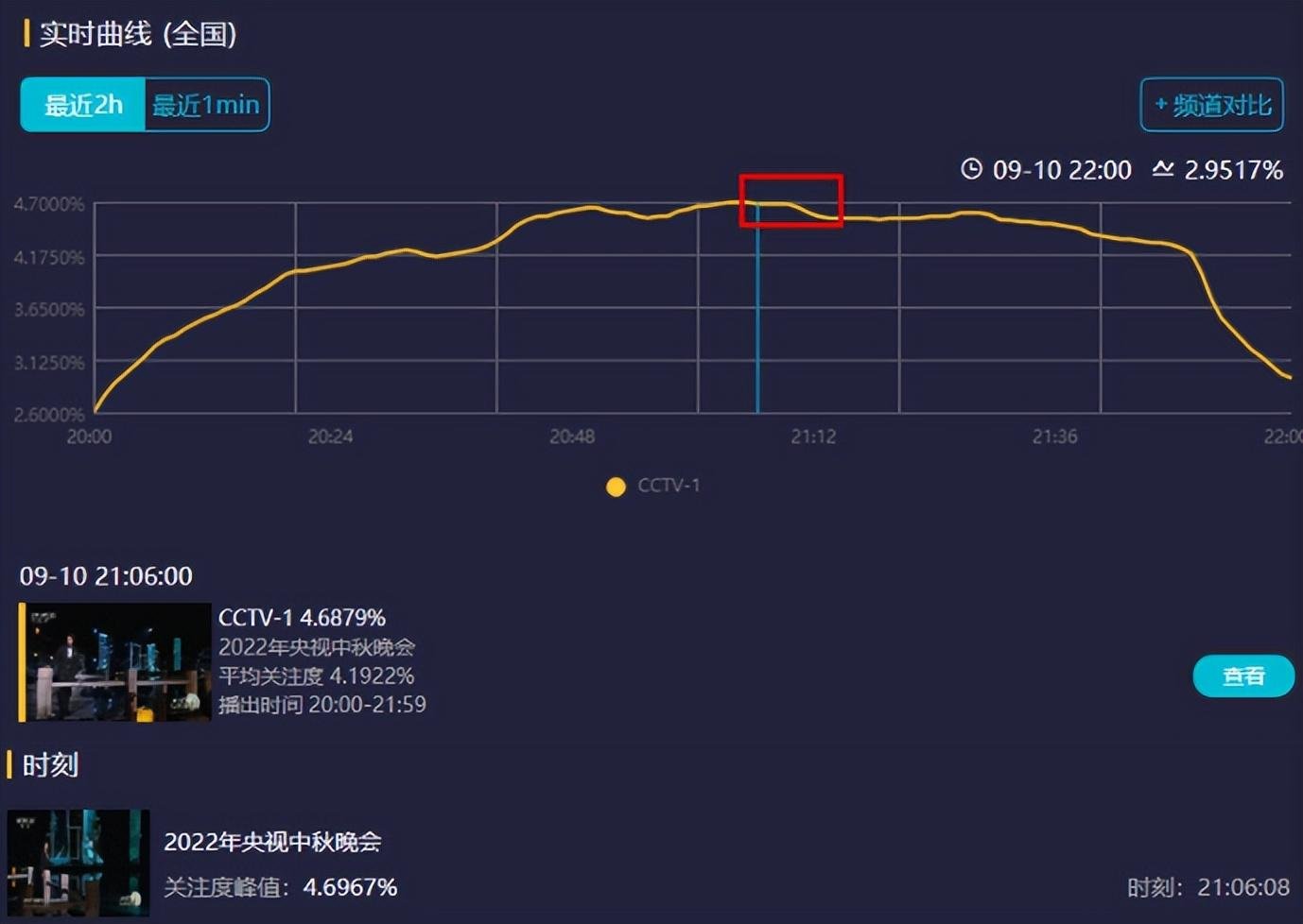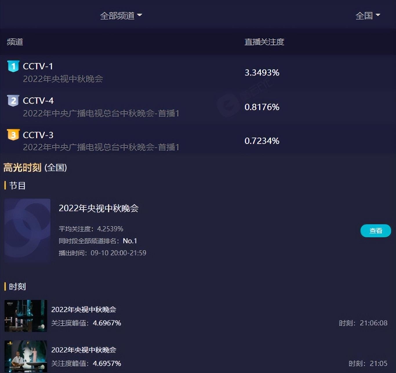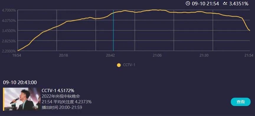 看看央视“秋晚”这个收视,开播破3,三大台直接拿下前三,均匀收视破4,最高点直逼4.7,又是当之无愧的晚会收视第一。