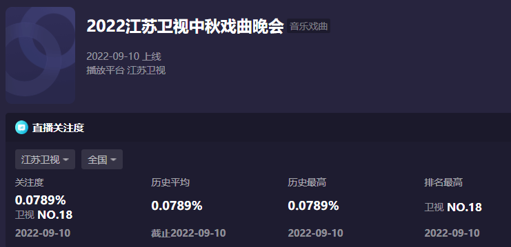 不外提早说好,江苏卫视此次算场外选手,由于他们并没有举行传统晚会,而是制造了一台戏曲晚会,受众无限收视率天然不高,均匀收视唯一0.0789。