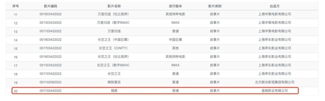 实际上,《搜救》早在9月23日就可以从中国电影数据信息网查询到编码。这意味着影院能下载密钥,进行排片。