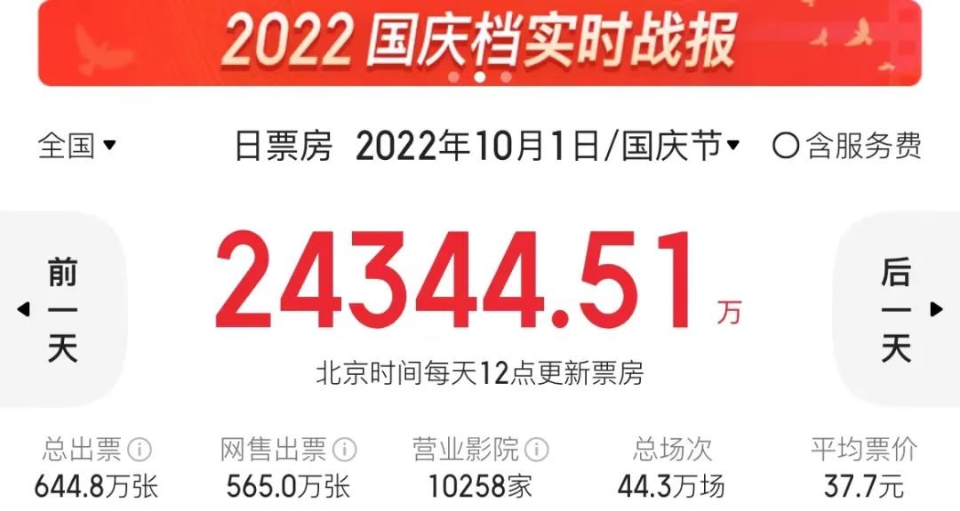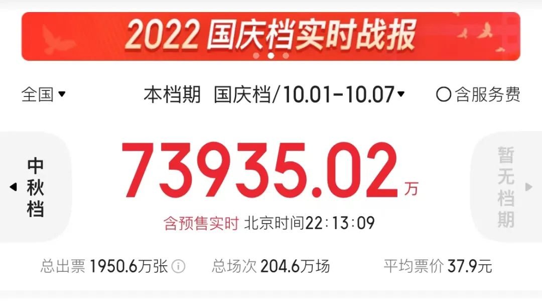 截至今朝,2022年国庆档票房打破了10亿,而此时国庆长假已过半。可以盖棺定论的是,间隔客岁同档期的40.68亿已是不克不及够完成的义务。