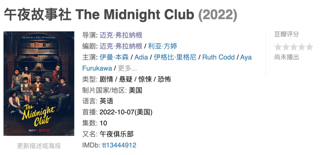 剧情简介转自豆瓣,在一间专门照护绝症青年的临终关心医疗机构里,八名病人每逢午夜聚在一同分享故事,并约好无论谁先脱离,都要从另一个世界传递讯息给未亡者。《午夜故事社》改编自克里斯托弗·派克 (Christopher Pike) 的1994年同名小说和其他作品。