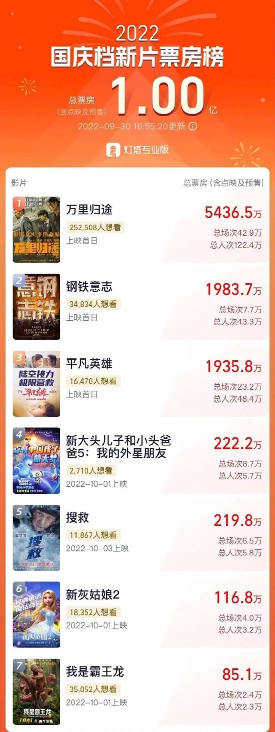 据灯塔专业版数据,截至9月30日16时55分,2022年国庆档新片总票房(含点映及预售)打破1亿,今朝《万里归途》以票房超5400万(含预售)领跑。