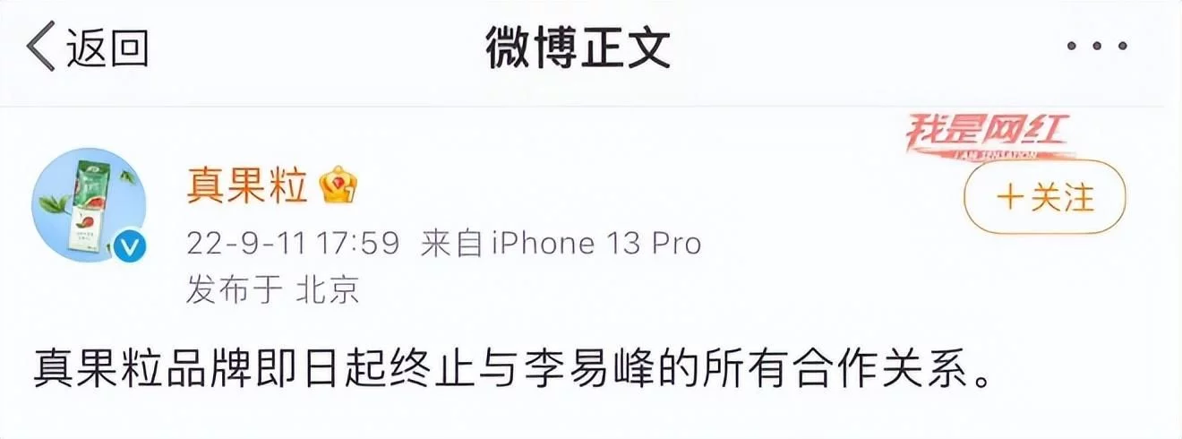 事情曝出后,9月11日晚,认证为内蒙古蒙牛乳业(集团)股份有限公司的@真果粒发声明称,克日起终止和李易峰一切协作关系。