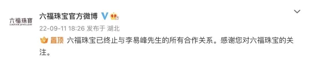 六福珠宝官微博透露显示,已终止与李易峰师长教师的一切协作关系。