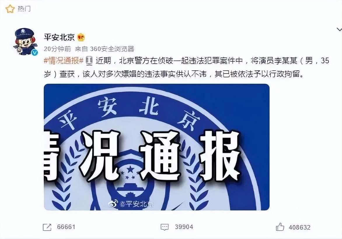 @平安北京 9月11日传递,近期,北京警方在侦破一同守法立功案件中,将演员李某某(男,35岁)查获,该人对屡次嫖娼的守法现实供认不讳,其已被依法予以行政拘留。