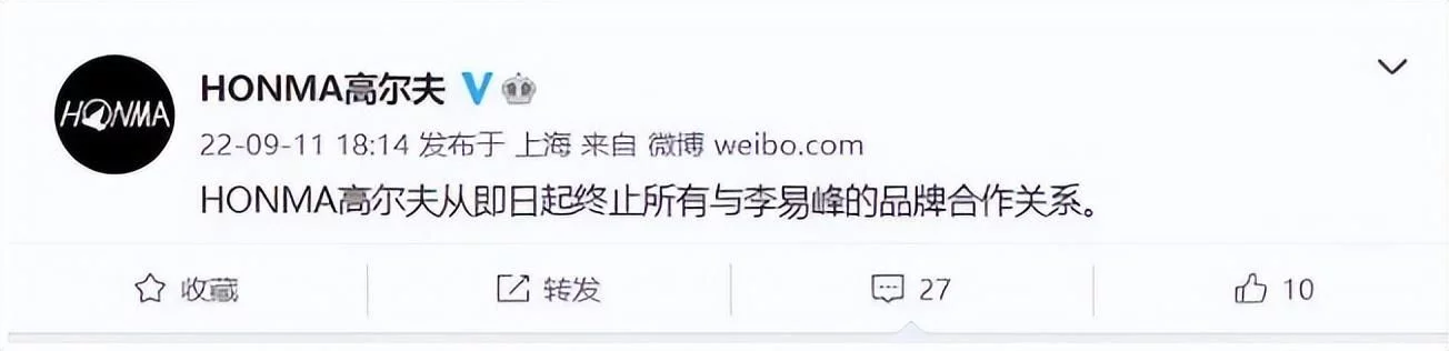 HONMA高尔夫官微公布,克日起终止一切与李易峰的品牌协作关系。