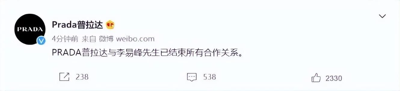普拉达微博公布,PRADA普拉达与李易峰师长教师已完毕一切协作关系。