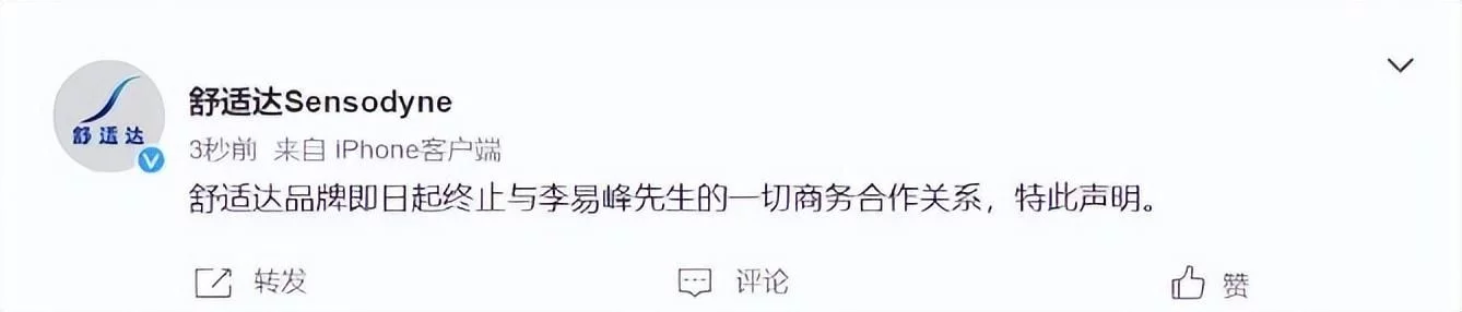 舒适达品牌:克日起终止与李易峰师长教师的一切商务协作关系,特此声明。