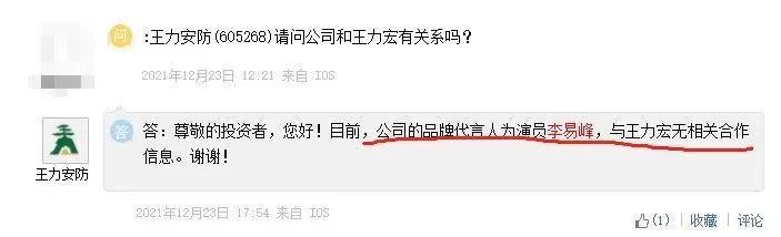 值得一提的是,此前王力宏事情就有股民将王力安防列为“王力宏出轨概念股”,以后在互动平台上,公司还造谣,称“今朝,公司的品牌代言人为演员李易峰,与王力宏无相干协作信息。”