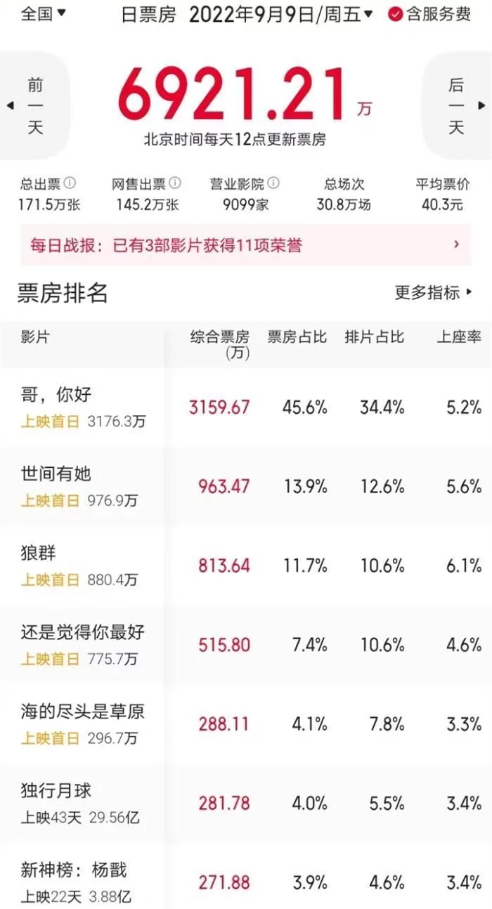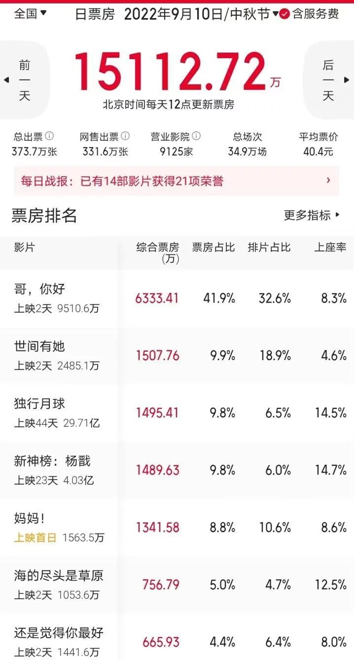 看点:2022年9月10日是中秋节,也是教师节,也是中秋档的第二天,我们来看一下票房战报。单日票房排名前五的电影是《哥,你好》《人间有她》《独行月球》《新神榜:杨戬》《妈妈!》。