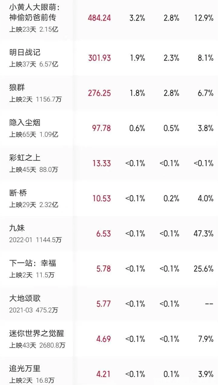 由张晋、李治廷、蒋璐霞主演的军事举措电影《狼群》,可以说是阅历了“悲喜两重天”。9月10日,《狼群》第一天上映,排片率10.7%,上座率6.1%。《狼群》的排片率不是最高的,然则上座率倒是最高的,单日票房高达880万。