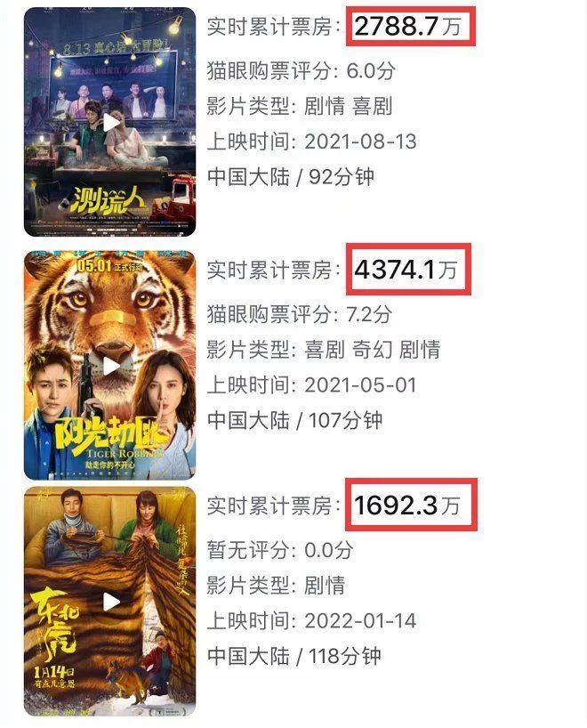 《阳光劫匪》《测谎人》和《西南虎》三部电影的累计票房还不到一亿元,乃至都缺乏她此前与沈腾协作时的电影的几日票房。