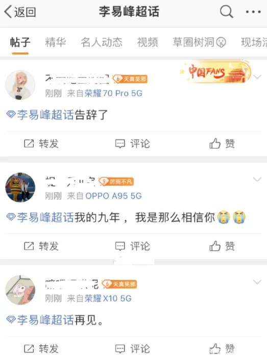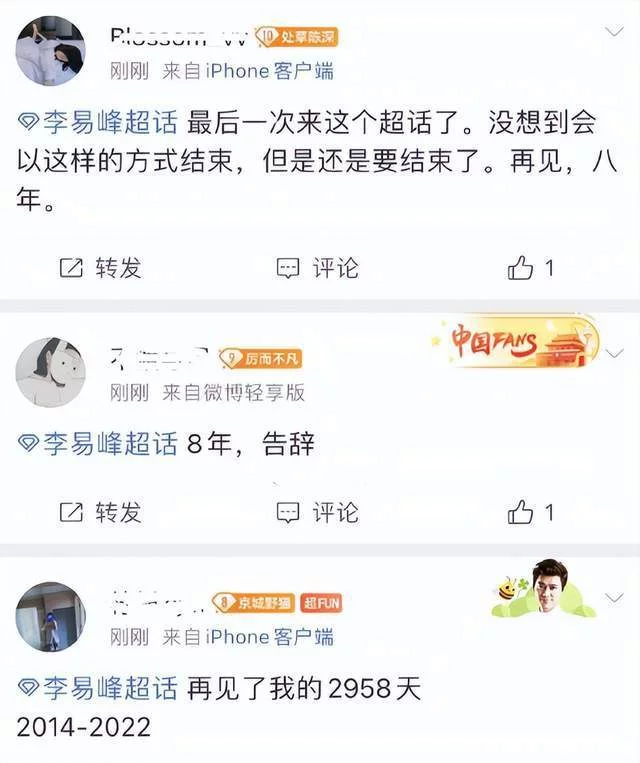 这些年粉丝们的真心也算是错付了,很快李易峰自己超话就被绝望的粉丝刷屏了,到了这个时分,看来他们也没有气力写长文了,大多只留下两个字——“再会”。