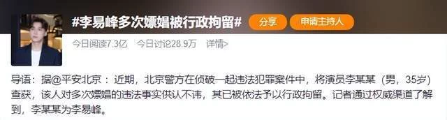 安全北京发布微博透露表如今侦破一同守法立功案件中,将演员李某某(男,35岁)查获,该人对屡次嫖娼的守法现实供认不讳,其已被依法予以行政拘留。