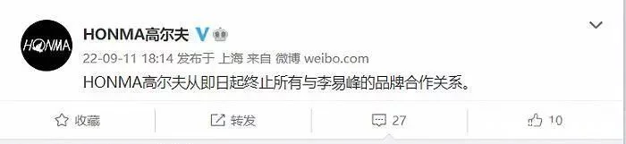 HONMA高尔夫公布,克日起终止一切与李易峰的品牌协作关系。