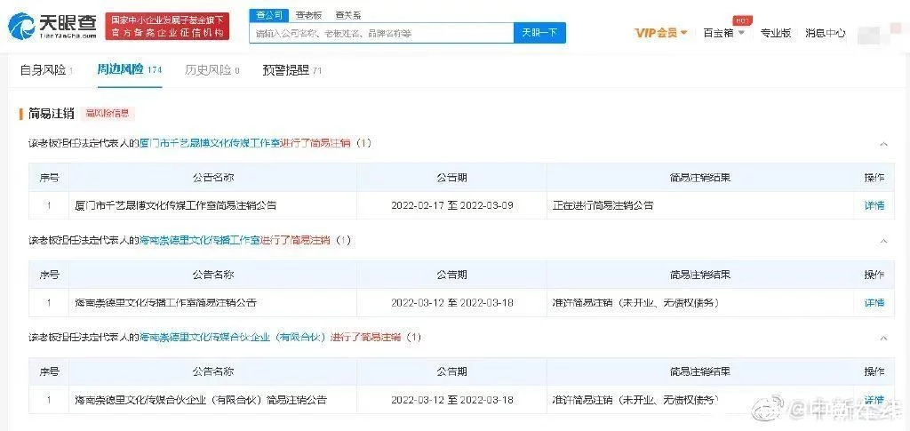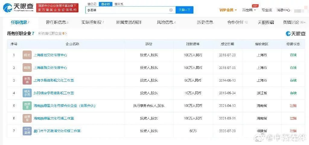 据@中新经纬 报导,天眼查App显示,李易峰共联系关系7家企业,个中4家为存续形态,包孕上海峰岩文化传媒中心、上海峰路文化传媒中心、上海李易峰影视文化工作室、东阳横店李易峰影视工作室,上述4家企业均为李易峰团体独资。值得一提的是,李易峰3家注销形态的企业均注销于今年3月、4月,个中,厦门市千艺晟博文化传媒工作室注销于3月15日,海南崇德里文化传播工作室、海南崇德里文化传媒合股企业(有限合股)于4月12日同一天注销。