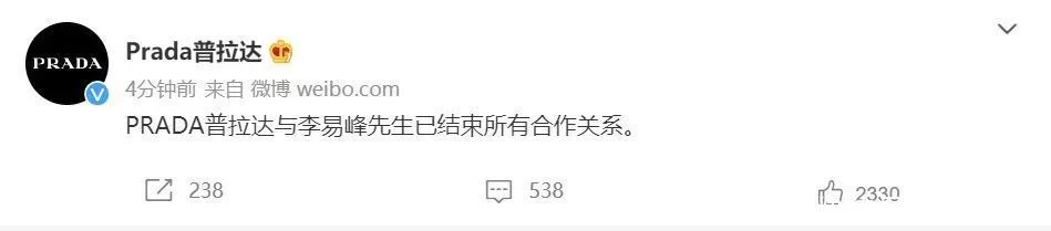 普拉达微博公布,PRADA普拉达与李易峰已完毕一切协作关系。