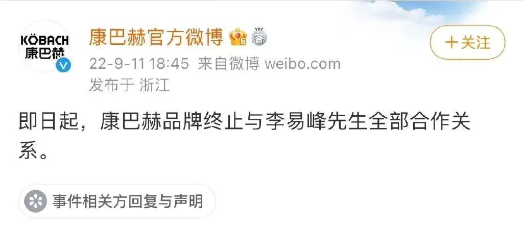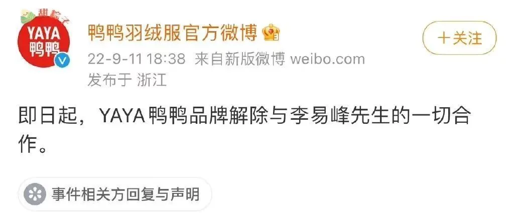 另外,还有鸭鸭羽绒服、康巴赫等品牌发声明与李易峰消除协作。
