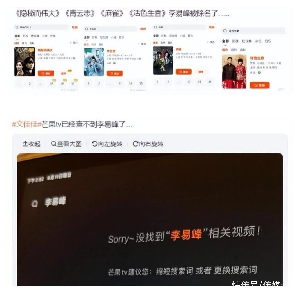 例如,多家代言品牌删除有关李易峰的静态,而且设置权限。已经出演的影视作品,在各大视频平台被除名(主演名字里没有了李易峰),热播剧也停播,被其它剧集替换。