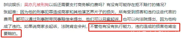 需求留意的是,此前掉德艺人吴某凡,在掉事被抓后,知名律师张起淮曾解读过,艺人由于团体缘由形成商家和其他演艺圈片子的损掉,一切遭到伤害和违约的代言费用,都可以经过刑事附带民事补偿来提出,他们可以另案告状,也可以向法院提出,由于艺人方面组成了违约。假如商家告状,法院一定会判,不论他(艺人)有无履行才能,违约形成的伤害一定要赔的。