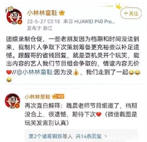 连那些着名的人都不焦急造谣,为什么魏晨要造谣呢?岂非魏晨被节目组溜过一次了?《快乐再出发》的任务人员已经发微博透露表现:第一季邀请过魏晨,但由于魏晨的档期不可,所以没有参与。那就阐明节目组照样很有诚意的,不是“光溜不请”。