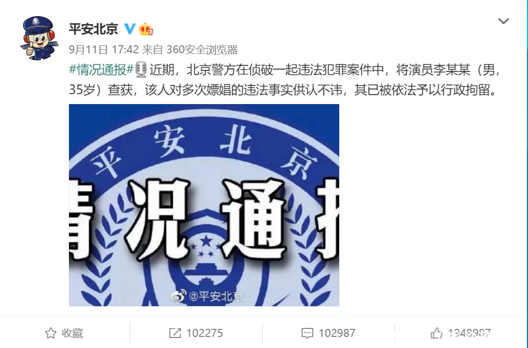 9月11日下午,“安全北京”发布状况传递,称近期北京警方在侦破一同守法立功案件中,将演员李某某(男,35岁)查获,该人对屡次嫖娼的守法现实供认不讳,其已被依法予以行政拘留。
