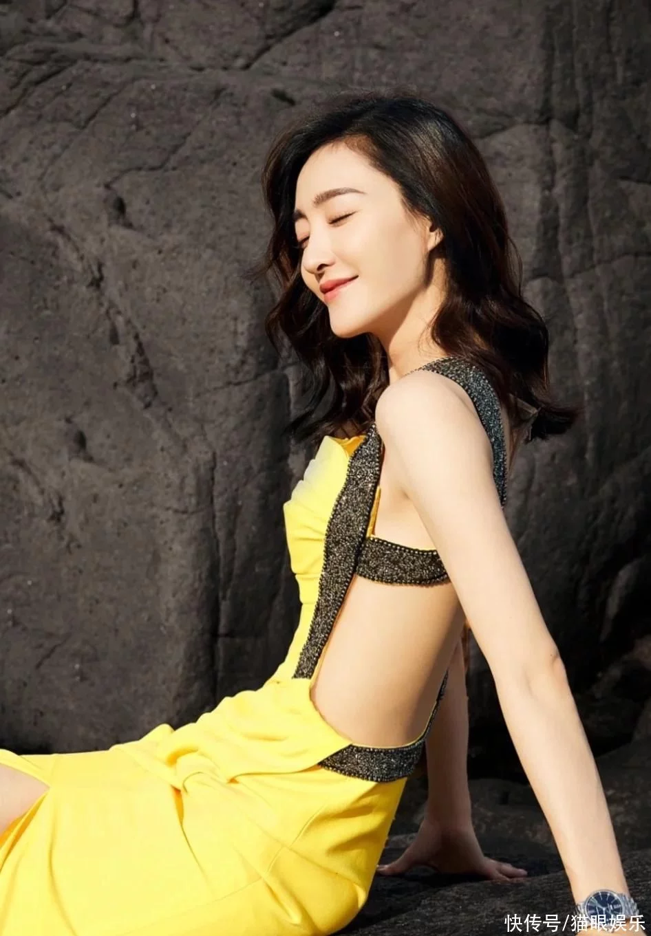 王丽坤坐礁石上拍美照,穿露背长裙大秀美背,身体火辣太吸睛