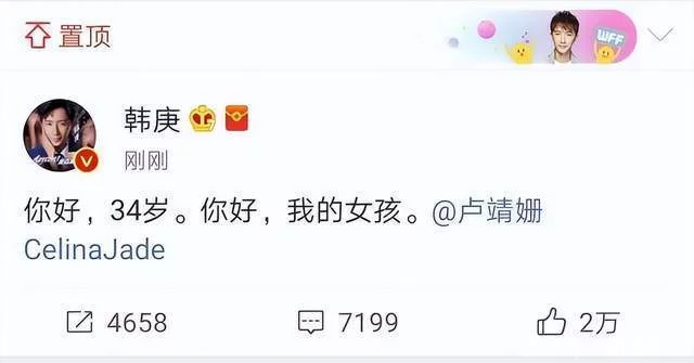 紧接着,在2018年2月9号,也就是韩庚34岁生日的时分,他在微博上地下了爱情。