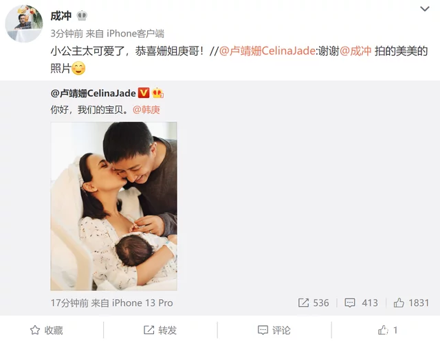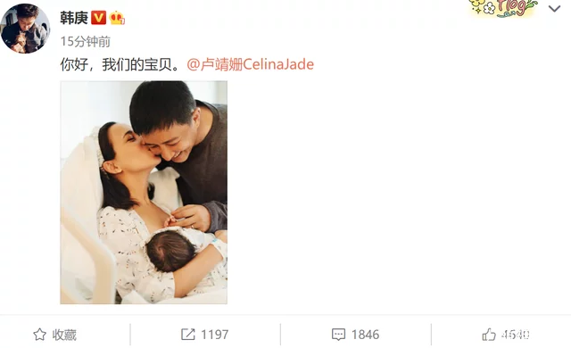 没过多久卢靖姗随即也转发了韩庚的微博,并配文:“你好,我的男孩”,很多韩庚的粉丝和网友纷繁送出了祝愿。