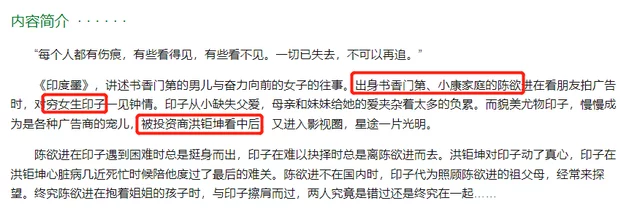 不久后亦舒推出小说《印度墨》,讲述了身世底层的女主为寂寂无名时爱上书香世家的男主,进入演艺界后移情别恋投资商,无情甩男朋友。