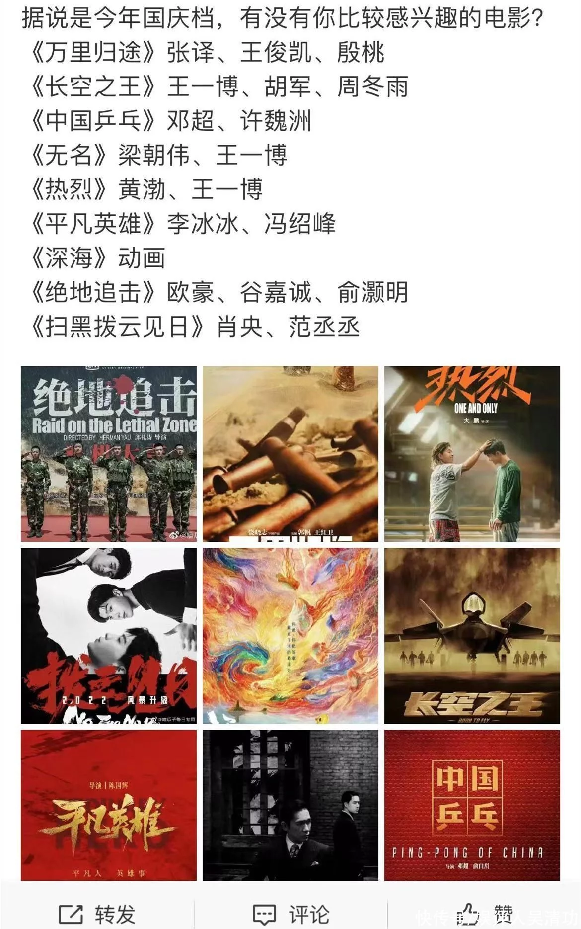 看点:网传今年国庆档有9部电影上映,辨别是《万里归途》《长空之王》《中国乒乓》《无名》《强烈热闹》《平凡英雄》《深海》《绝地追击》《扫黑拨云见日》。