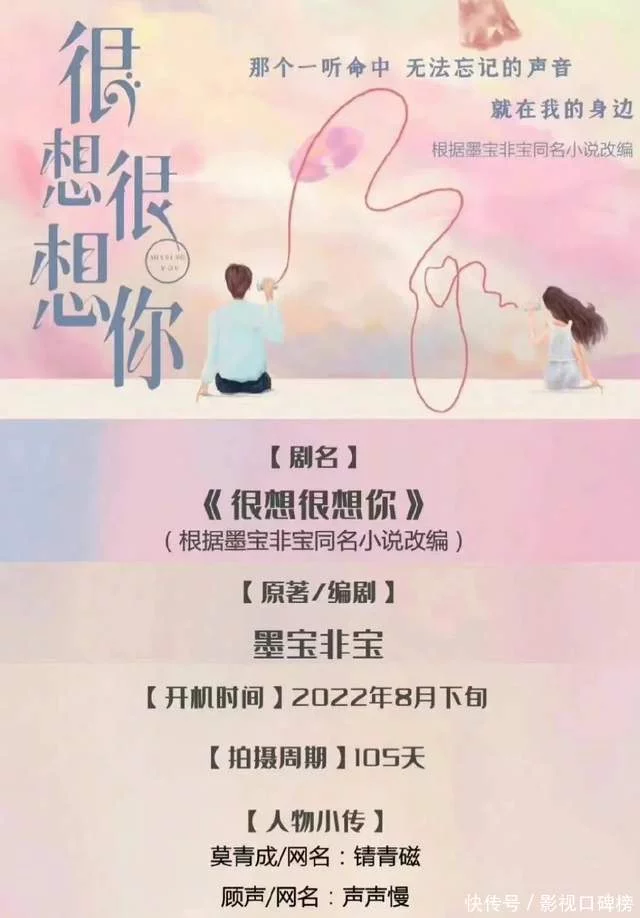 改编自墨宝非宝同名小说的《很想很想你》最近行将开机,檀健次在剧中扮演男主“莫青成”,周也扮演女主“顾声”。但许多原著粉对选角布置非常不满,以为檀健次身高不敷,外形又太油腻,基本不相符小说男主形象。