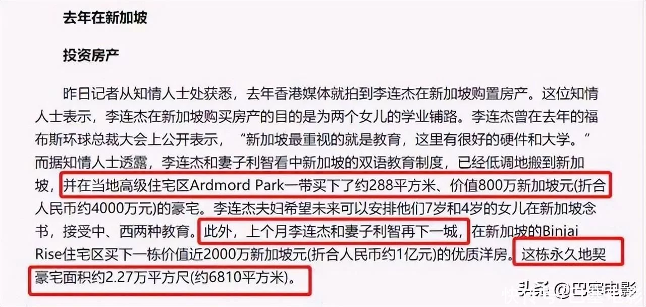 除上海,李连杰早在2007年,为了让女儿承受双语教育,在新加坡直接置办了了两套房产。更厉害的是,个中一套还具有永世寓居权。跟着新加坡房价水长船高,这两套别墅也让李连杰完全挣翻了,不能不慨叹他的目光是真不错。