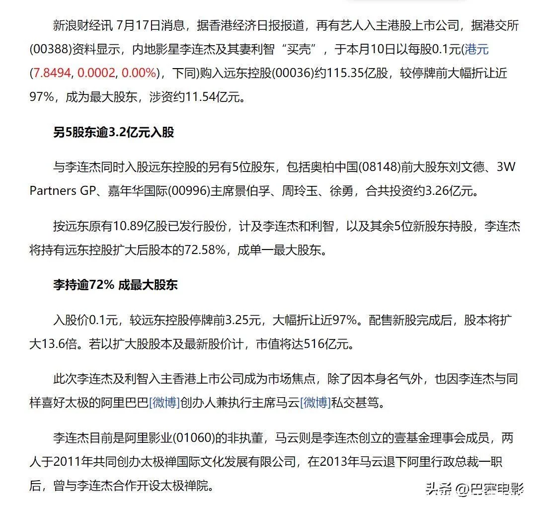 2015年时,李连杰就花了11.54亿收买了香港上市公司远东控股的股票。