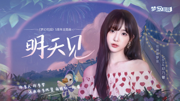 9月21日,《梦幻花园》5周年庆典全面开启!本次周年庆推出全新主题曲,特别邀请歌手Nene郑乃馨作为“花园星梦官”倾情演绎《梦幻花园》主题曲——《明天见》。一起来倾听歌里的故事吧!