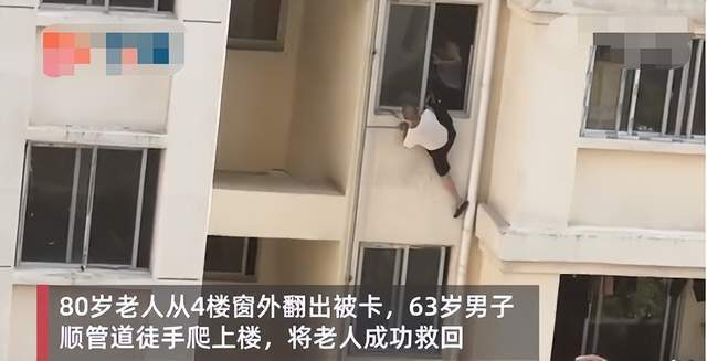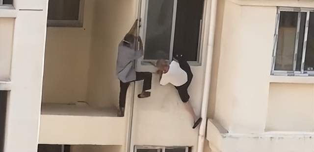 一名63岁的大叔看到这一幕,没有一点踌躇地顺着燃气管道飞快爬上楼,翻身进屋后又将白叟拉回屋内。