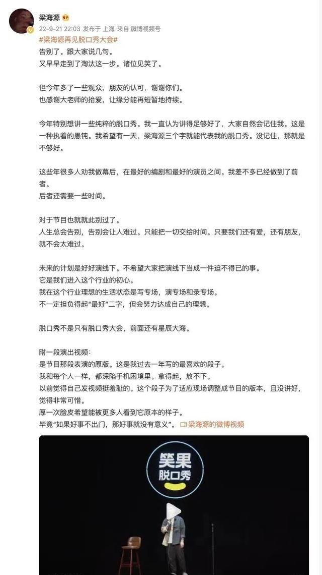 徐志胜在海源脱离后说了如许一番话:“海源这些人好不轻易让脱口秀出圈,效果我们倏忽冒出来,享用了许多声誉和光环,总觉得本人其实是站在伟人的肩膀上的。这个行业脱颖而出的人太多了,还有许多线下的演员值得被人人看到。”