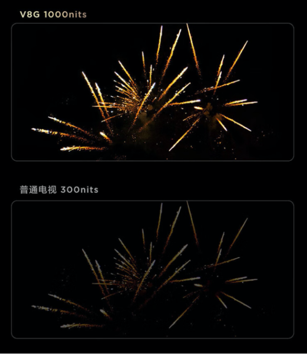 对比TCL V8G的百级背光分区与1000nits的峰值亮度,谁更良心一点也不用多说了。因为如果你对电视画质有一定了解的话,就会知道背光分区数量与我们电视画面呈现效果是息息相关的,相较于几十级分区的海信E5H,百级分区的TCL V8G带来的画质提升相当显著,能让画面层次细节更丰富,且大幅减少光晕,更不用说还有1000nits的峰值亮度了,更能让大光比的实际画面得到更好呈现。