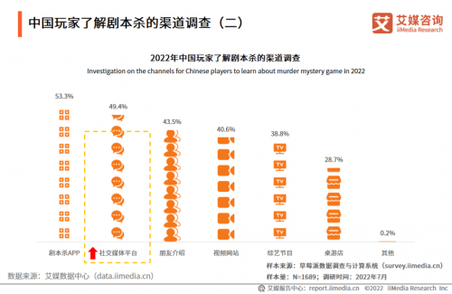 数据显示,2022年,中国受访玩家理解脚本杀的渠道首要是脚本杀APP,占比53.3%;比拟于2021年,2022年受访玩家理解脚本杀的第二个渠道是社交媒体而非电视节目。艾媒咨询剖析师以为, 跟着脚本杀普及度的进步,脚本杀玩家愈来愈乐于在社交媒体上发布脚本杀的相干信息,增进了群众对脚本杀的理解。