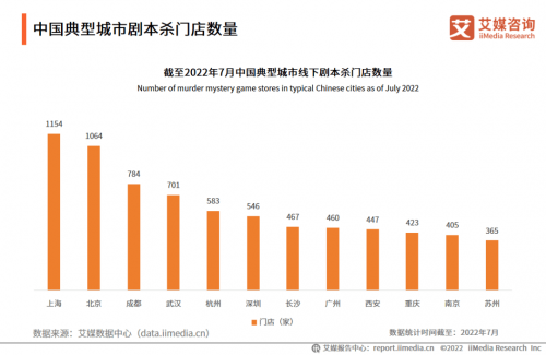 数据显示, 截至2022年7月,上海脚本杀门店数目超越1000家,高于北京、深圳和广州,另外,典型的网红城市如成都,脚本杀门店数目近800家。艾媒咨询剖析师以为,经济实力排名靠前的城市,城市居民的生涯和任务节拍比拟快,压力指数也比拟高,关于脚本杀等沉浸式重体验的游戏的需求会更高。而成都、武汉等地将脚本杀与文旅连系睁开,也带动了外地脚本杀门店数目的增进。