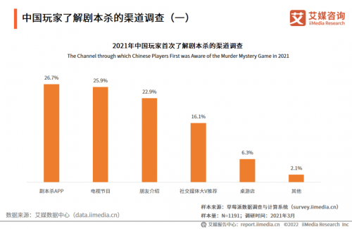 数据显示,2021年,中国受访玩家初次理解到脚本杀的渠道首要是脚本杀APP,占比26.7%,如脚本杀、百变大侦探、我是谜等;其次是电视节目,占比25.9%,诸如《明星大侦探》等。艾媒咨询剖析师以为, 脚本杀经过线上APP与相干综艺节目“出圈”,并成功吸引玩家或观众到线下脚本杀门店消费。