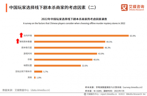 数据显示,比拟于2021年,2022年受访玩家选择线下脚本杀商家时首要的思索要素时店内情况,占比为65.9%;其次思索的要素为具有脚本数目,占比为49.5%。艾媒咨询剖析师以为, 脚本杀商家可以改良店内情况,打造恰当的脚本气氛,增添玩家的沉浸式体验感。