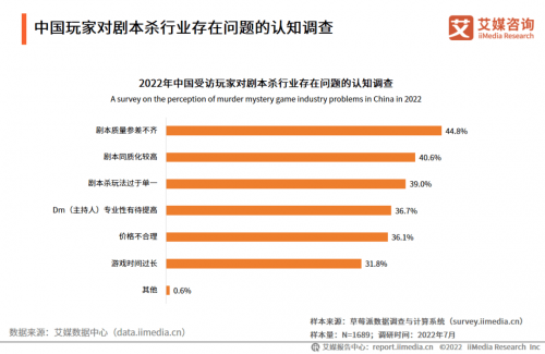 查询拜访显示,2022年,今朝中国网友关于脚本杀行业的存在成绩认知首要集中在脚本上,脚本的质量良莠不齐、同质化水平高和弄法单一是网民以为脚本杀行业需求改善的中央。另外,36.7%网民以为脚本杀的主持人专业水平也有待进步。艾媒咨询剖析师以为,脚本杀的下游今朝缺少对脚本质量的标准化磨练,只能经过业内睁开展会、交流会等情势对脚本的质量进行磨练。将来, 脚本质量的有用磨练流程和主持人的职业化培训都是脚本杀行业睁开的首要保证。