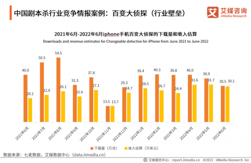 2020年,百变大侦探资助第六季明星大侦探,iphone手机下载量在2021年6月-8月这段工夫偏高。今朝,iphone手机的百变大侦探APP共有1027.0万次下载量,其预算的支出呈动摇上升的趋向。艾媒咨询剖析师以为,百变大侦探在脚本杀APP中的下载量较高,具有必然市场优势。百变大侦探可以经过进步用户的体验感、优化脚本等体式格局稳固其市场优势。