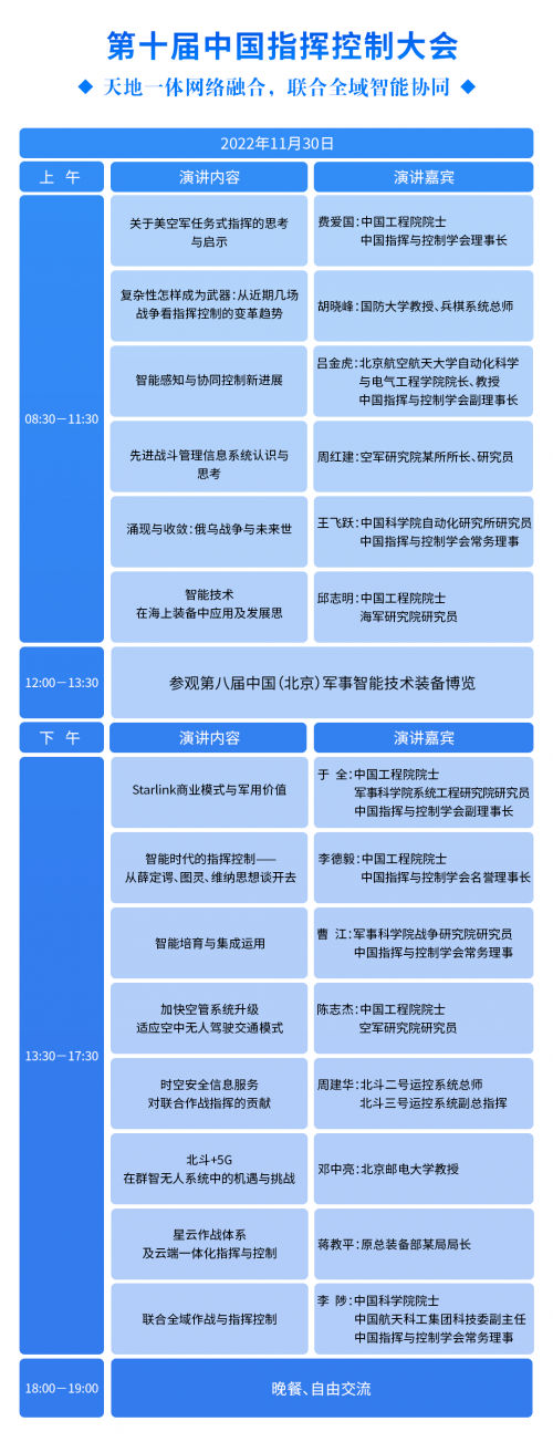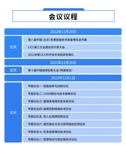 “2022第十届中国批示节制大会暨第八届中国(北京)军事智能手艺配备展览会”的详细工夫布置以下: