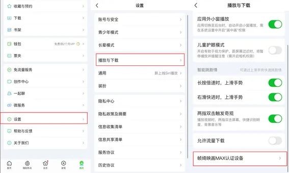 爱奇艺今朝是业内第一家用户可自查询“帧绮映画MAX认证装备”清单的平台。用户翻开爱奇艺APP,点击“我的-设置”,进入“播放与下载”页面,便可检查今朝一切支撑“帧绮映画MAX”规范的机型。